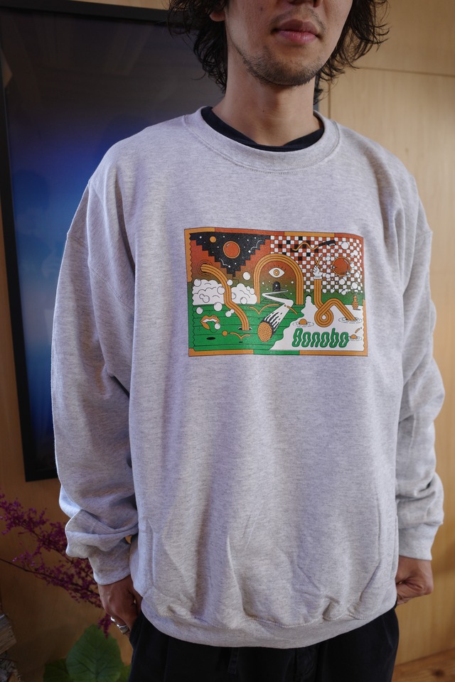 2025/ssに好評だったBonoboのサイケデリックなデザインのTシャツに続き、秋冬仕様のスウェットが登場しました。 ashとnavyの2色の展開にそれぞれに配色を変えてプリントしました。 ボディはゆったりワイドシルエットの裏起毛です。